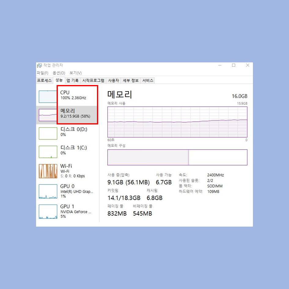 RAM은 그림을 보면 알 수 있듯이 프로그램 몇 개만 조금 무겁게 돌리면 9.2GB를 사용하는데 기존에 8GB 램으로는 부족해서 사용함에 있어 꽤 불편함이 있었습니다. CPU도 100% 사용하는 것을 볼 수 있고 기존에는 RAM도 80~90%의 사용률을 보여주었습니다.