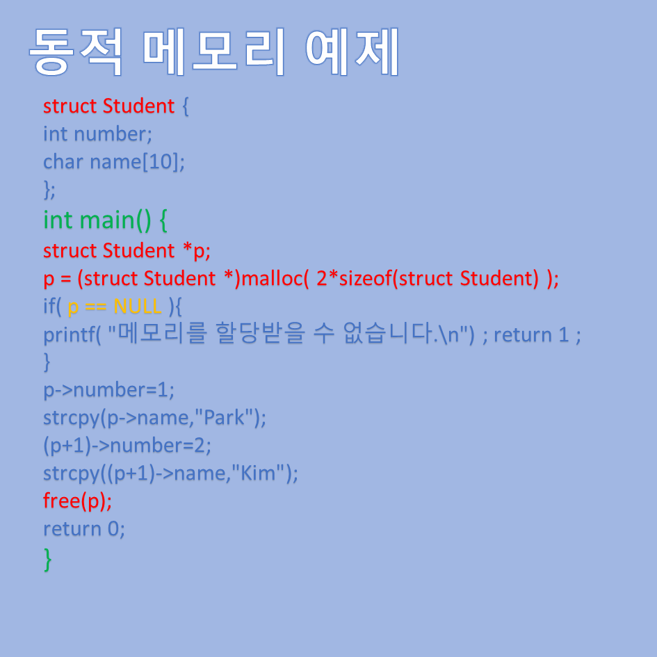 학생들의 정보를 담는 구조체를 선언하였고 메인 함수에서는 구조체 Student의 포인터 변수 *p를 선언하고 p를 할당받습니다. 만약 할당받지 못한다면 "메모리를 할당받을 수 없습니다."고 출력하고 1을 반환하고 종료합니다. 할당받았다면 2명의 학생 정보를 변경하고 동적 메모리를 해제합니다.