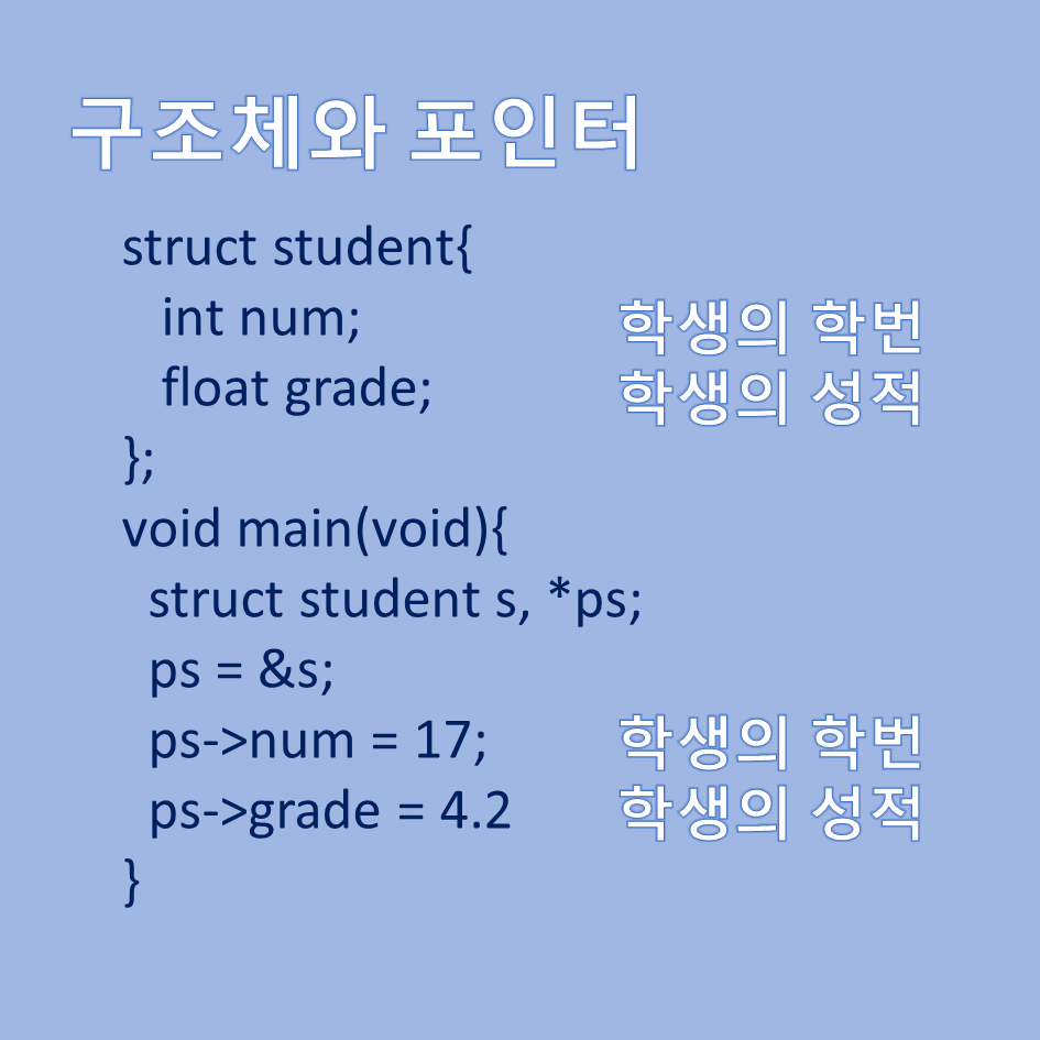 포인터를 이용하여 구조체의 멤버를 접근할 때는 ->을 이용하여야 합니다. 그래서 ps->num이라는 것은 ps가 가리키는 구조체 변수 s의 멤버인 학번 num을 의미합니다. 그래서 ps-> num = 17이라는 것은 s의 학번은 17이고 ps -> grade = 4.2는 s의 성적은 4.2라는 것을 의미합니다.