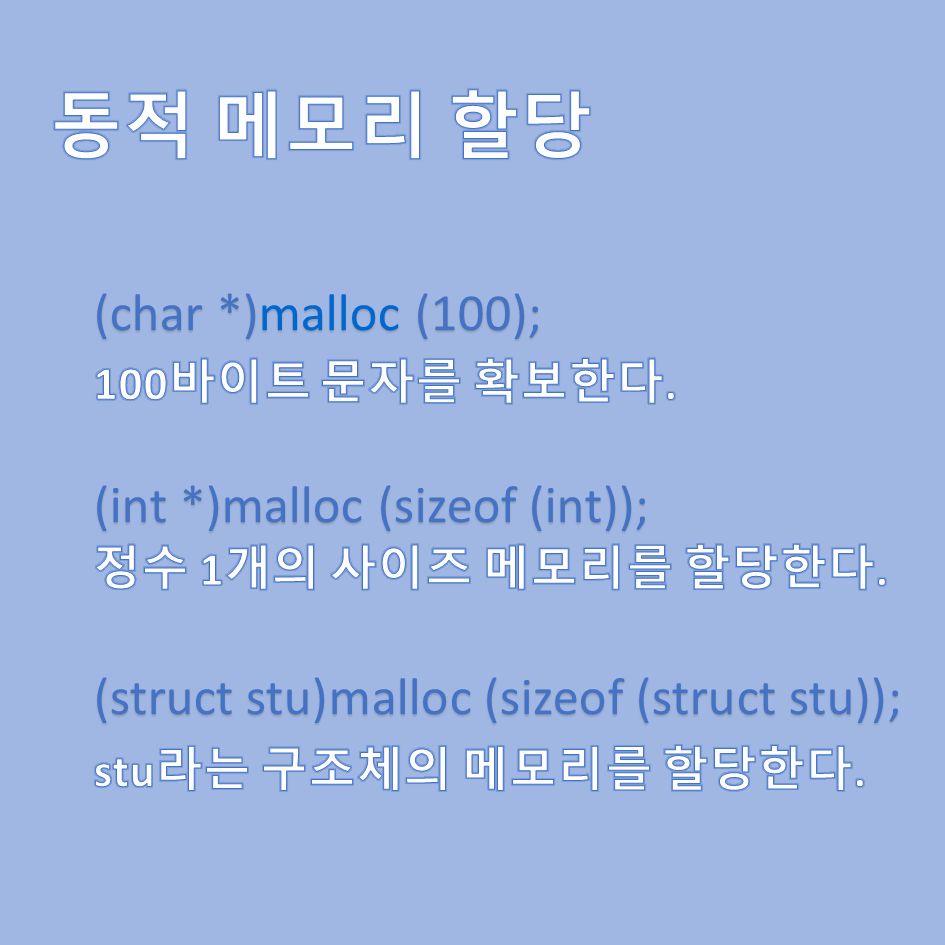 메모리 할당받는 것에 대해서 자세히 알아보겠습니다. malloc( )에서 괄호 안에는 바이트 단위의 크기가 들어갑니다. 그래서 그 크기만큼의 메모리를 확보합니다. 앞에 char, int, sturct는 자료형으로 첫 문장은 100바이트로 100개의 문자를 저장할 메모리를 확보하고 두 번째는 정수 1개를 저장할 메모리를 확보합니다. 세 번째는 stu라는 구조체에 해당하는 메모리를 할당받습니다.