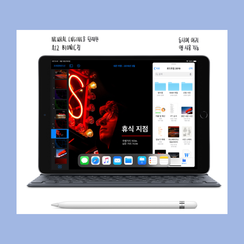 이번에는 가장 많은 사람이 구매하는 아이패드 에어 입니다. 최신모델이 3세대로 곧 새로운 세대의 모델이 출시될 것으로 기대됩니다. 크기는 10.5인치로 아이패드 7세대보다 조금 더 큽니다. 아이패드보다 더 좋은 A12 Bionic 칩이 탑재되어 있으며 아이패드 프로가 과하시다면 추천해 드립니다. 아이패드 에어로는 필기는 물론 간단한 영상작업, 높은 사양 게임을 모두 사용할 수 있습니다. 스마트 키보드와 애플펜슬을 지원합니다. 최대 용량은 256기가로 아이패드에서 부족했던 저장공간의 문제를 해결할 수 있습니다. 사실 공부하는 대학생들이나 간단한 작업만 하는 사람들은 아이패드 에어를 가장 많이 구매합니다.