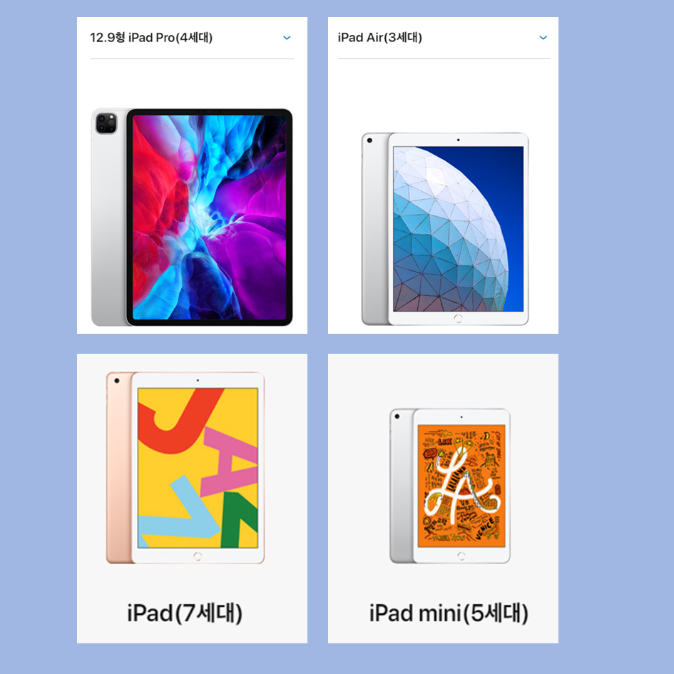 안녕하세요 학생, 성인 구분 없이 많은 사람이 사고 싶어 하는 제품인 아이패드에 대해서 말해보려고 합니다. 며칠 전에 갤럭시 탭 S7 시리즈가 출시되었고 사전예약에서 첫날에 모두 마감되는 일까지 생겼습니다. 요즘에는 집에서 비대면으로 하는 활동이 늘어나면서 많은 사람이 노트북이나 태블릿 PC에 관심이 많은 것 같습니다. 그러면서 태블릿 시장에서 절대 강자인 아이패드에도 관심이 많이 끌리고 있습니다. 아이패드에는 종류가 많은데요 그래서 많은 사람이 무슨 기종을 선택해야 하는지 잘 모르기 때문에 오늘 무슨 아이패드를 선택하면 좋은지 정리해드리겠습니다.