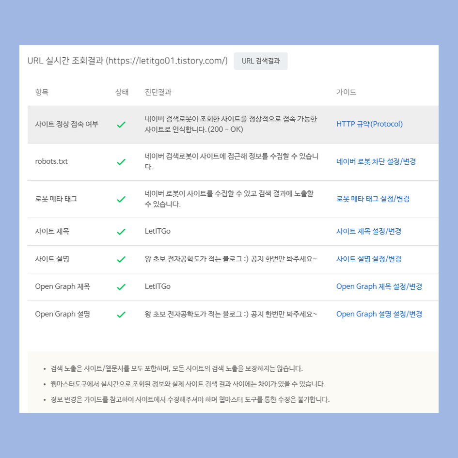 URL 입력 칸에 아무것도 입력하지 않고 확인을 누르면 상태가 나옵니다. 모든 상태가 양호합니다. 만약 항목 중 오류가 있으면 파란 체크가 아닌 빨간색이나 노란 체크가 나올 수 있습니다. 이때는 오류를 다시 수정해야 합니다.