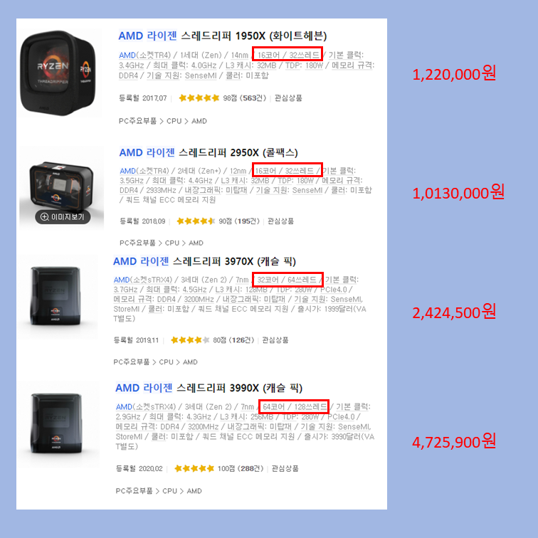 위의 2개 CPU는 16코어 32 쓰레드로 사실 앞의 그림에 있는 3950X를 이용하는 것이 더 좋습니다. 그 이유는 3950X는 AM4 소켓을 이용하기 때문에 쿨러, 메인보드와 같은 부수적인 제품들이 더 저렴하기 때문입니다.
