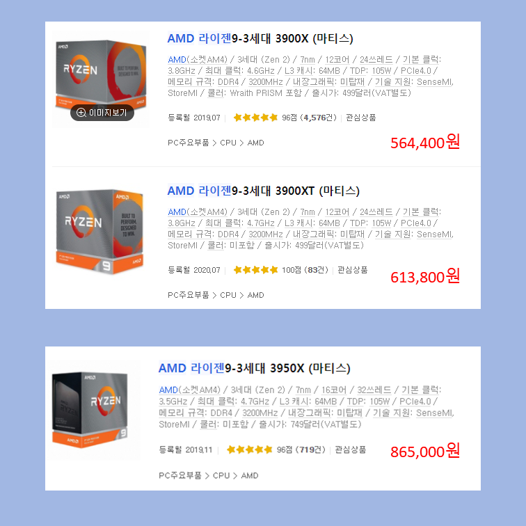 위의 두 제품은 12코어 제품입니다. 둘 다 12코어 24스레드이며 메모리 최대 클럭만 다릅니다. 심지어 다른 기술도 같은데 가격은 5만 원 정도 납니다. 만약 12코어 제품을 구매한다면 무조건 3900X가 좋은 것 같습니다.