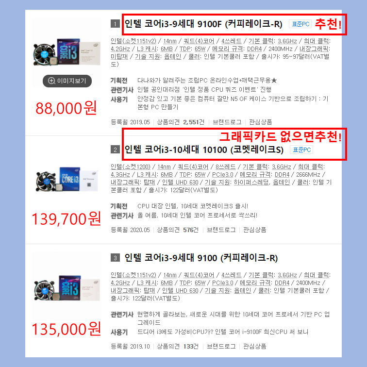 i가 붙은 제품군들에 주의해서 봐야 할 점이 있습니다. K, F 등 숫자 뒤에 이런 알파벳이 붙은 제품들이 같다고 구매하면 안 됩니다. 그림에서도 9100F, 9100 제품이 있는데 가격 차이는 약 5만 원 정도 있습니다. 그 이유는 9100F에는 내장 그래픽이 없기 때문입니다. i3부터는 많은 사람이 외장 그래픽카드를 이용하기 때문에 내장 그래픽이 없는 CPU들을 구매하는 사람들이 많습니다.