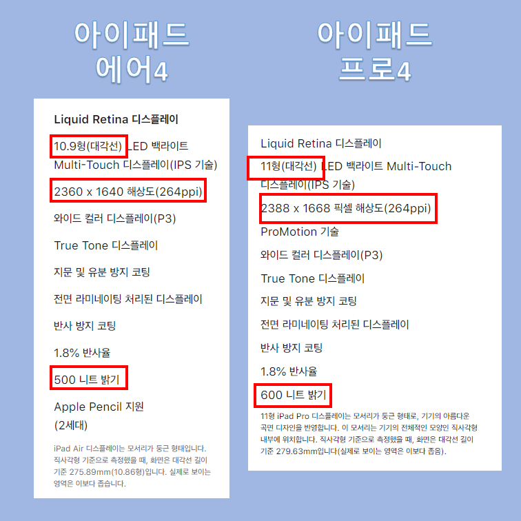 그럼, 사람들이 가장 궁금해하는 아이패드 프로 4세대 11인치 모델과의 차이점에 대해서 알아보겠습니다. 그럼 디스플레이부터 알아보겠습니다. 큰 차이점은 없지만 크기도 0.1인치 정도 차이가 난다고 되어 있습니다. 화면 해상도는 프로 4세대가 조금 더 좋고 밝기가 100니트 정도 더 밝습니다. 화면만 봐서는 어느 정도 비슷하지만 조금은 프로 4세대가 더 좋은 것 같습니다.