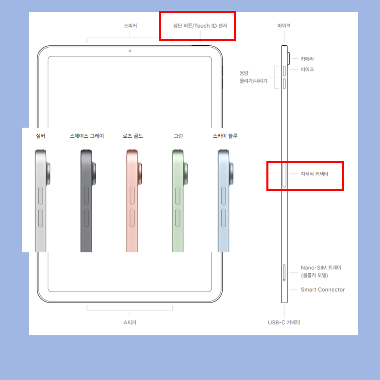아이패드 에어 4세대는 10.9인치 모델만 있습니다. 그리고 색상은 실버, 스페이스 그레이, 로즈골드, 그린, 스카이블루 이렇게 총 5가지 색상이 있습니다.