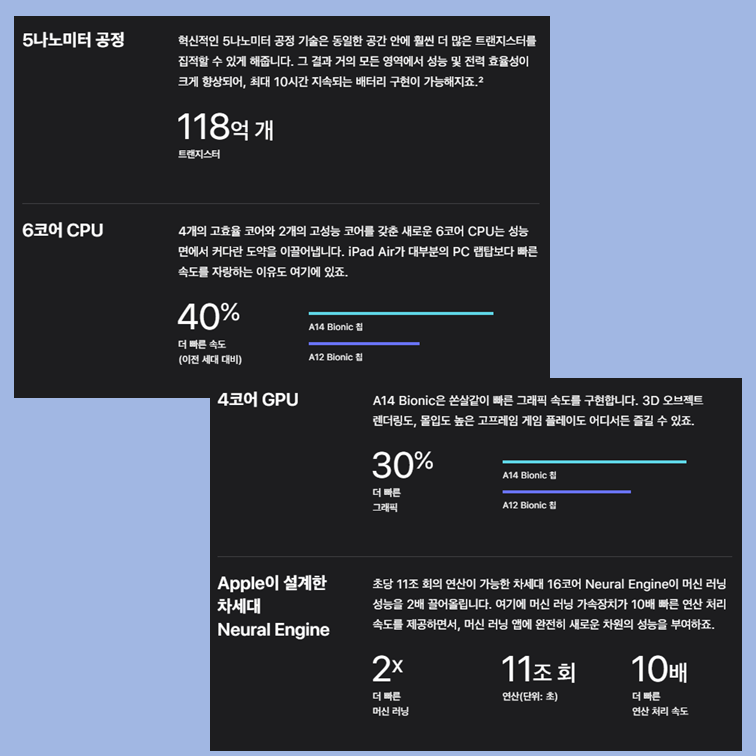이번에는 CPU입니다. 그럼 A14 바이오닉에 대해서 알아보겠습니다. 아이패드 에어에는 A14 바이오닉이 탑재되어 있고 아이패드 프로에는 A12 바이오닉을 탑재하고 있습니다. 그럼 프로보다도 더 높은 CPU를 가지고 있는 것인데 얼마 정도의 성능 차이가 있는지 애플이 공개하고 있는 자료에 대해서 알아보겠습니다.