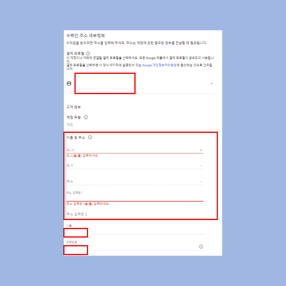 우편번호도 한국의 우편번호로 입력해야 합니다. 나중에 애드센스에서 중요한 PIN이 담긴 편지를 보내기 때문에 정확해야 합니다.
