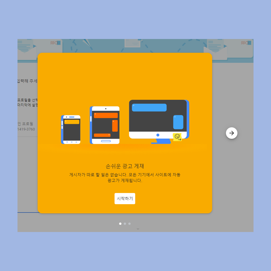 구글 애드센스 광고를 달기 위해서는 애드센스 가입을 해야 합니다. 홈페이지에 접속하여 시작하기 버튼을 눌러줍니다.