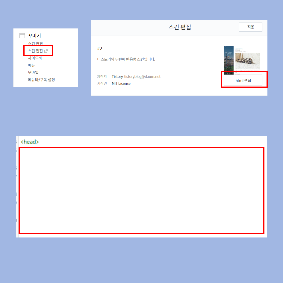 티스토리의 꾸미기에 스킨편집이 있습니다. 새로 뜨는 창에 html 편집을 누릅니다. 그럼 매우 복잡한 코딩 글이 있는데 그중에서 <head> 아래에 광고 코드를 삽입합니다.